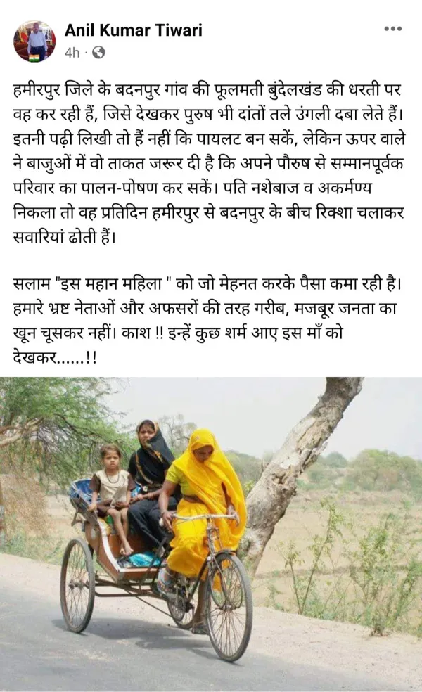 बुंदेलखंड की रहने वाली एक महिला कैसे अपनी जिजीविषा से अपने और परिवार के भरण पोषण का इंतज़ाम करने के लिए रिक्शा चलाने तक को मजबूर है महिला की यह तस्वीर पुरुष प्रधान समाज को एक तमाचा है जो यह सीख दे रही है कि जब पुरुष नकारा हो जाए तो घर महिला कैसे घर की चौखट पार कर अपने अस्तिव को बचाने के लिए समाज में संघर्ष करती है (UP Hamirpur Badanpur Female Riksha Chalak Viral Post Photo News In Hindi)