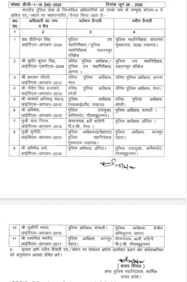UP IPS Transfer Latest News:यूपी में 15 के बाद 11 औऱ आईपीएस अफ़सरों के तबादले की लिस्ट जारी कई जिलों के पुलिस कप्तान बदले