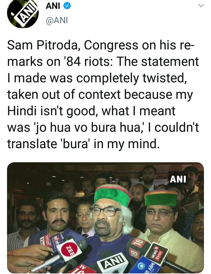 कांग्रेसी नेता सैम पित्रोदा के बयान को भाजपा ने हाँथो-हाँथ लेते हुए कहा कि दुःख होता है जब कोई उस सिख दंगे की याद दिलाता है। पित्रोदा के इस बयान की चारो ओर निंदा हो रही है..पढ़े युगान्तर प्रवाह की एक रिपोर्ट..